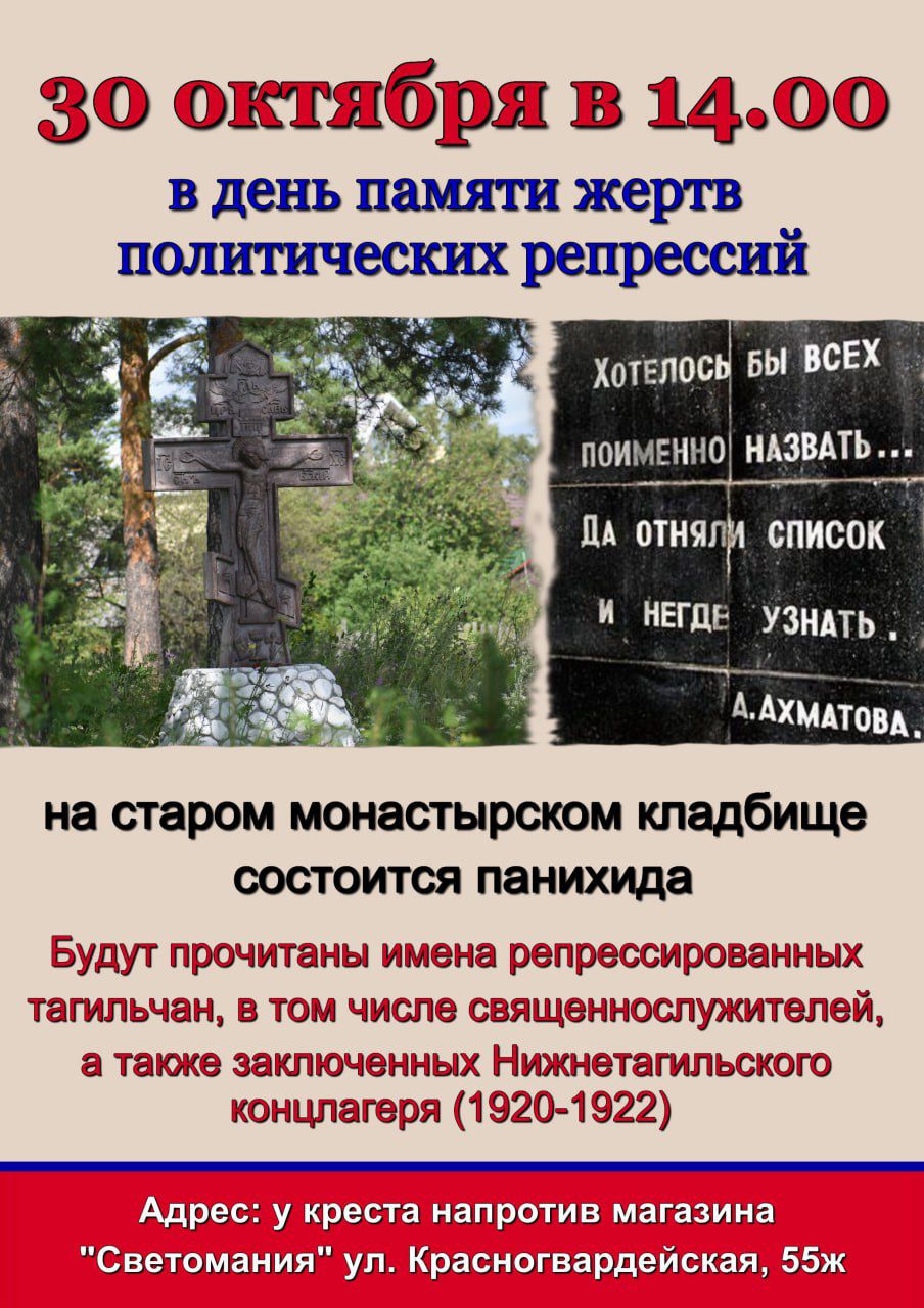 Братья и сестры, существует многолетняя традиция — в этот день совершать панихиды по невинно убиенным и читать списки пострадавших от репрессий. Приходите читать вместе с сестрами Скорбященского монастыря имена репрессированных в 1930-х годах тагильчан и тех, кто оказался в лагере в стенах обители.