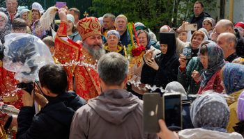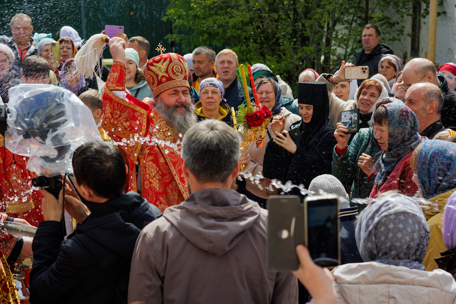 По окончании Божественной литургии состоялся праздничный крестный ход. Под ликующие пасхальные возгласы «Христос Воскресе!», пение тропарей праздника и радостный трезвон колоколов священнослужители и миряне обошли собор, совершая четыре остановки для чтения Евангелия. У стен Преображенского собора, где обрели место своего упокоения наместники обители, была совершена заупокойная лития.