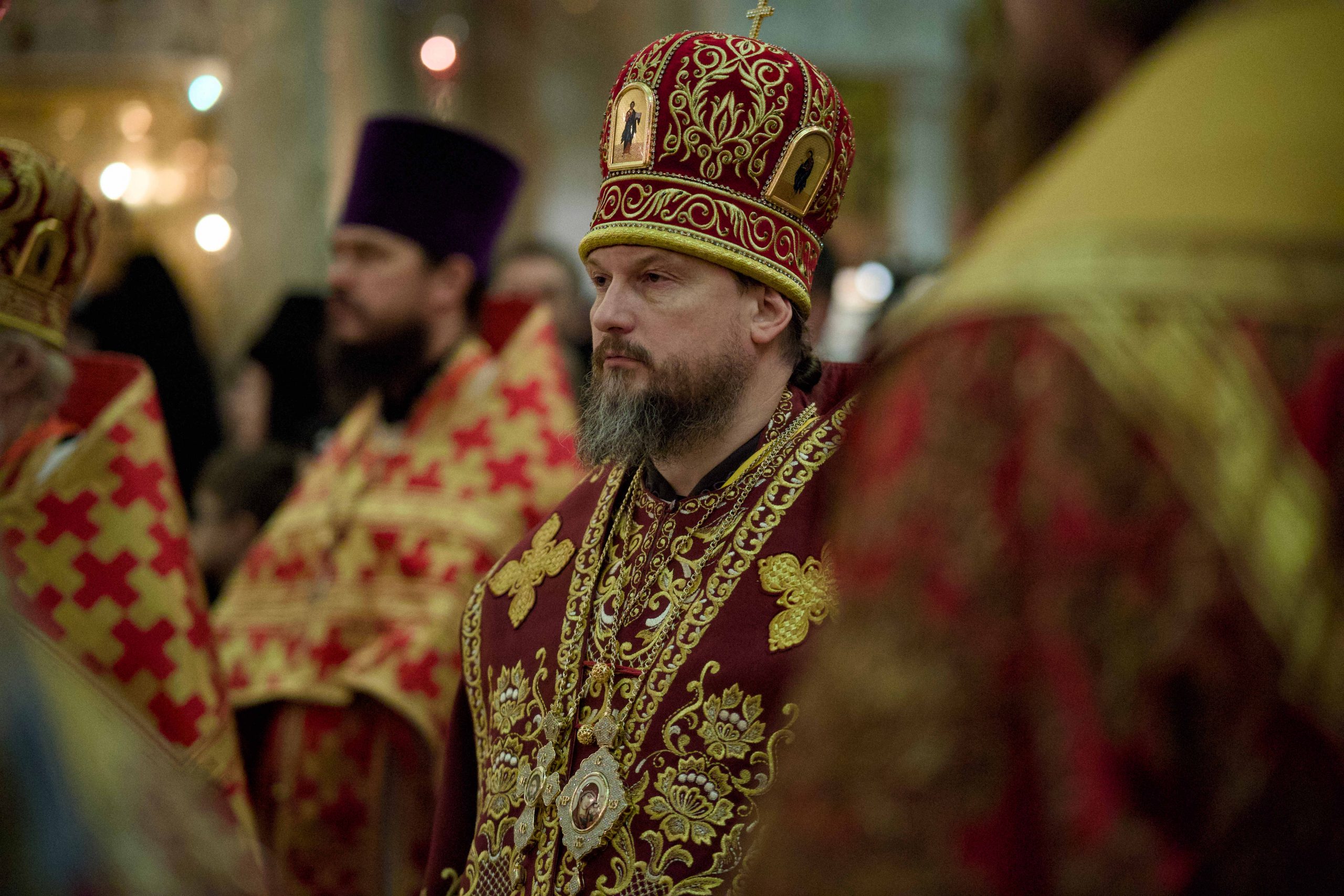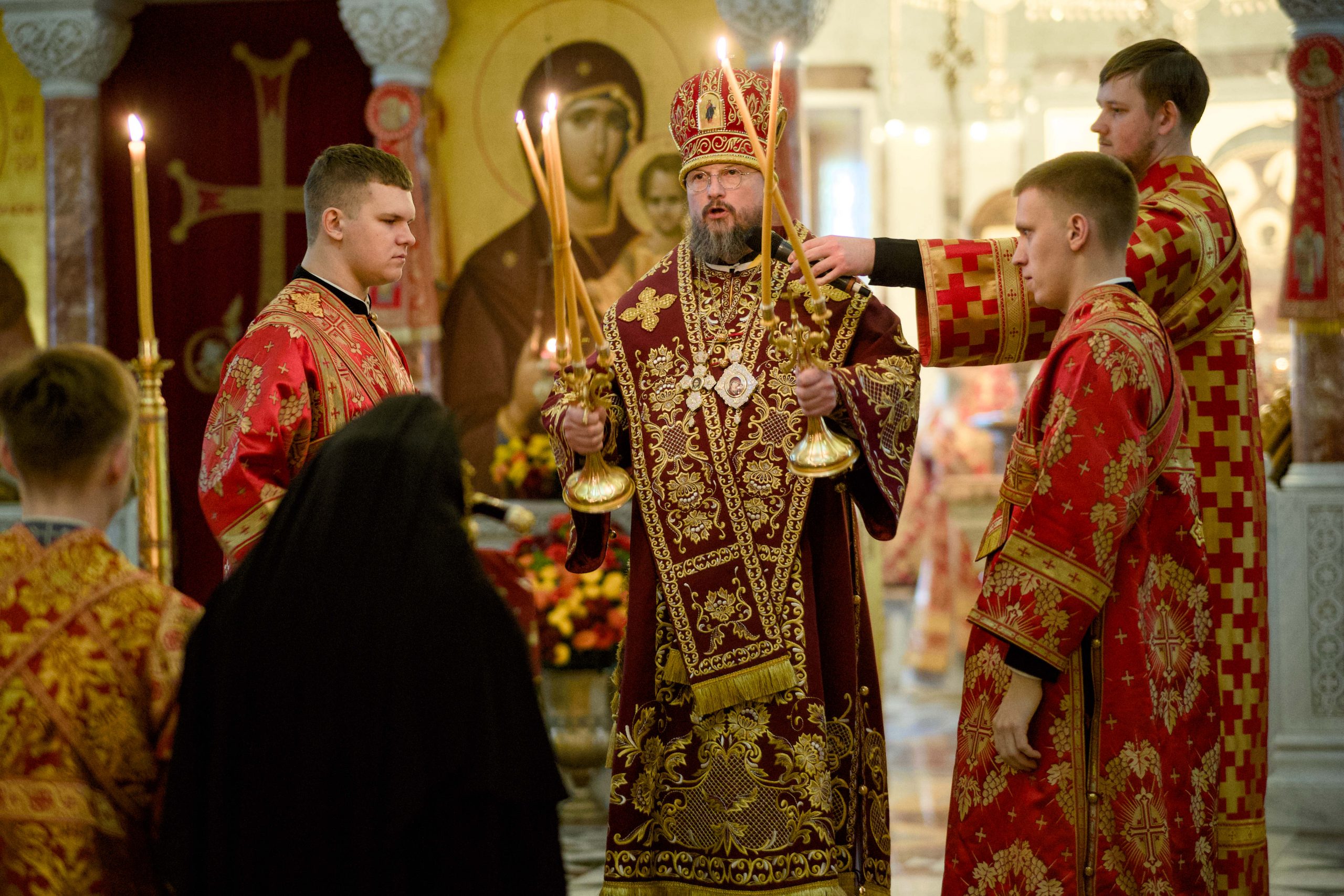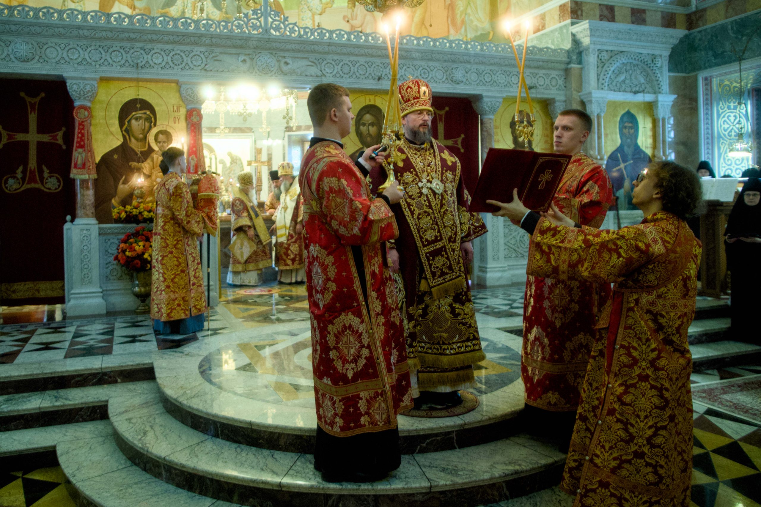 Архипастырям сослужили секретарь Екатеринбургской епархии протоиерей Николай Тарантин, настоятель Преображенской церкви города Екатеринбурга митрофорный протоиерей Николай Ладюк, настоятель Свято-Троицкого собора митрофорный протоиерей Николай Малета, благочинный Монастырского округа Екатеринбургской епархии игумен Иероним (Миронов), руководитель отдела по утверждению трезвости и профилактике зависимостей, настоятель Никольского храма при Уральском горном университете протоиерей Игорь Бачинин; старший священник Храма-Памятника на Крови, руководитель отдела по взаимоотношениям Церкви с обществом и СМИ протоиерей Максим Миняйло, настоятель Успенского храма города Верхняя Пышма, ректор Екатеринбургской духовной семинарии иеромонах Корнилий (Зайцев), духовенство собора и другие клирики Екатеринбургской епархии.