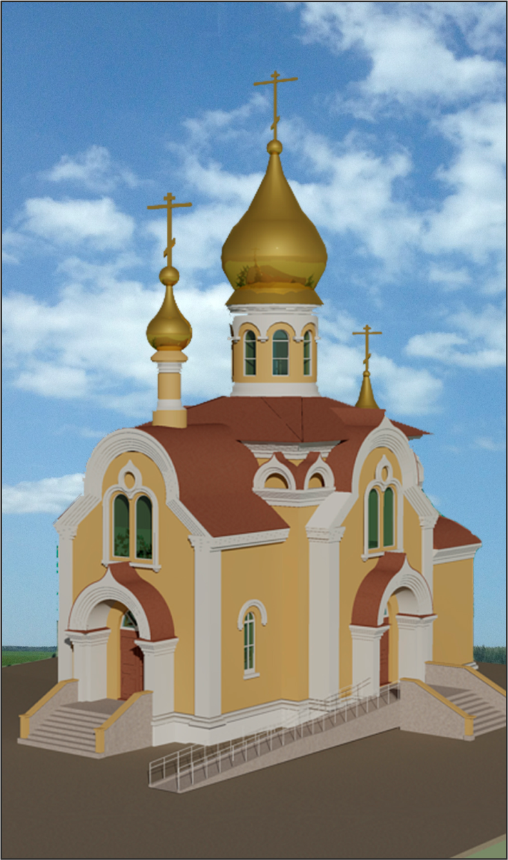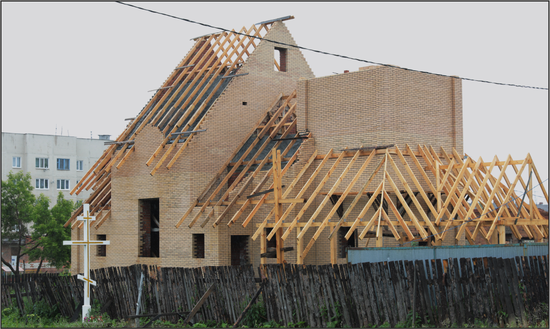 Строительство храма в городе Кировград. Вместимость — 150 чел., общая площадь -334 м2, строительный объем выше отм. 0,000 — 1000 м3, высота до подкрестного шара — 12,7 м.