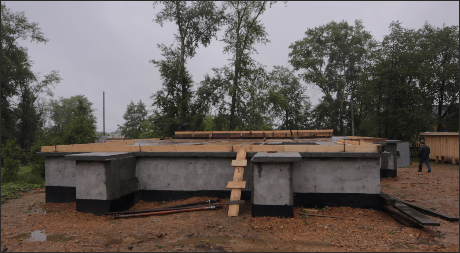 На данный момент выполнены работы по устройству фундамента, устройству стен цокольного этажа, гидроизоляция наружных стен подземной части здания, обратная засыпка пазух котлована.