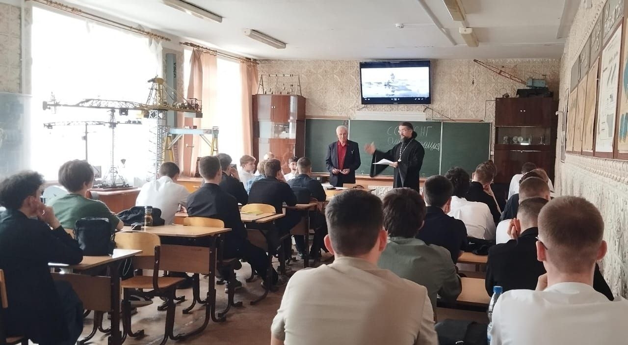 По просьбе обучающихся и с согласия руководства учебного заведения на урок был приглашён настоятель храма святого благоверного князя Александра Невского города Нижнего Тагила, иерей Алексий Бессонов.