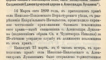 (Благодарность в подготовке материала члену Российского военно-исторического общества Роману Леонидовичу Арефьеву. По материалам «Екатеринбургских епархиальных ведомостей», № 8 от 16 апреля 1899 года).
