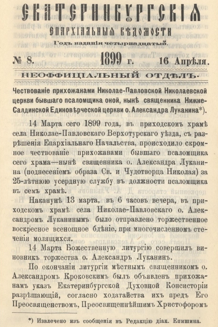 В апреле 1899 года в «Екатеринбургских епархиальных ведомостях» была опубликована заметка о чествовании прихожанами Николаевской церкви в селе Николо-Павловское псаломщика («ныне священника Нижне-Салдинской Единоверческой церкви о. Александра Луканина») в марте 1899 года.