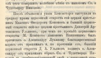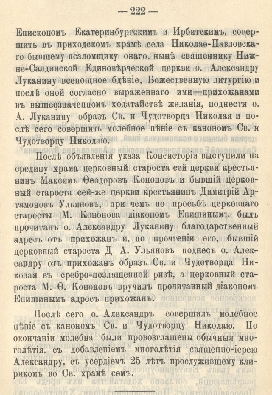 После объявления указа Консистории по просьбе церковного старосты Максима Федоровича Кононова диаконом Епишиным был прочитан благодарственный адрес от прихожан отцу Александру Луканину, а после прочтения бывший церковный староста Дмитрий Артамонович Ульянов преподнес отцу Александру от прихожан образ Святителю и Чудотворца Николая «в сребро-позлащенной ризе», а церковный староста Кононов вручил ему прочитанный диаконом Епишиным благодарственный адрес. После этого отец Александр совершил молебное пение с каноном Святителю и Чудотворцу Николаю. По окончании молебна были провозглашены многолетия, с добавлением многолетия священноиерею Александру, с усердием 25 лет прослужившему клириком в этом храме.
