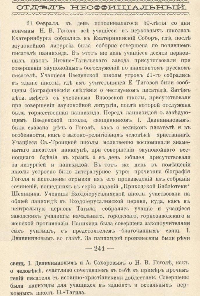 21 февраля (6 марта по нов. ст.), в день 50-летия со дня кончины Николая Васильевича Гоголя, учащиеся десяти церковных школ Нижнетагильского завода присутствовали при совершении заупокойных богослужений по знаменитом русском писателе.