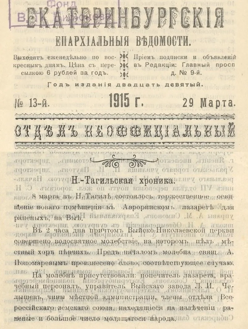 (Благодарность в подготовке материала члену Российского военно-исторического общества Роману Леонидовичу Арефьеву. По материалам «Екатеринбургских епархиальных ведомостей», № 13 от 29 марта 1915 года)