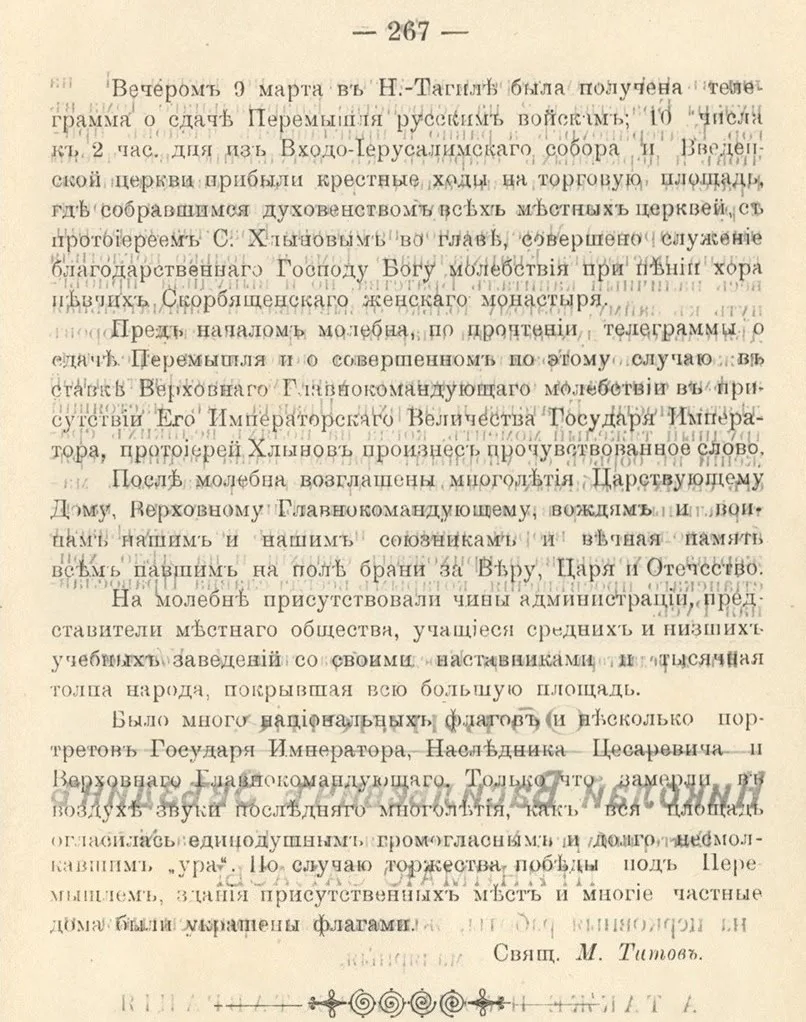 Вечером 9 марта (22 марта по нов. ст.) в Нижнем Тагиле была получена телеграмма о сдаче австрийской крепости Перемышль русским войскам.