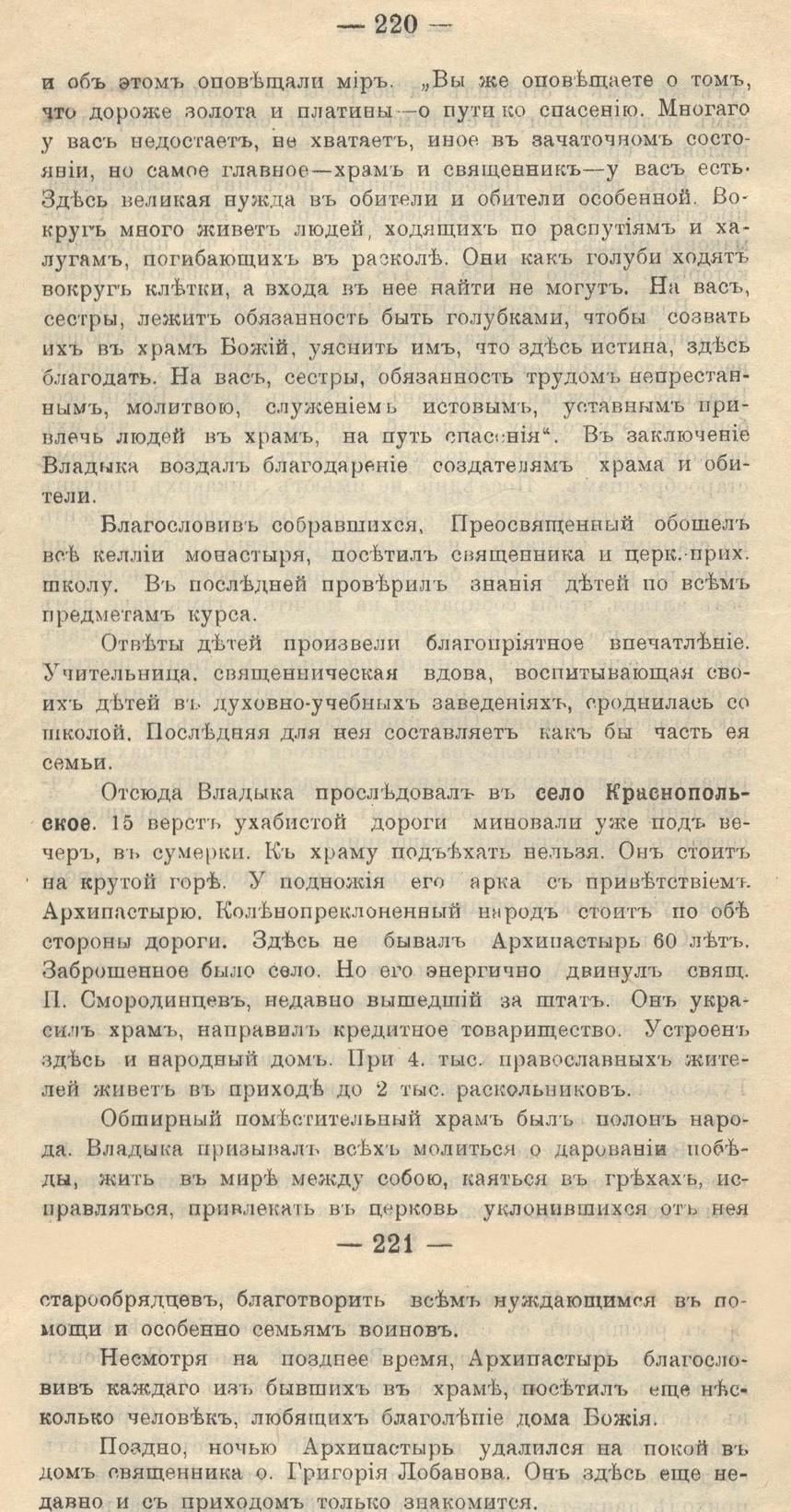 Из училища Преосвященный Серафим, посетив священника, проследовал в единоверческую церковь в честь Казанской иконы Богородицы. Священник, отец П. Ломаков, приветствуя Владыку, рассказал ему, что прихожане, которых всего 185 мужчин и 178 женщин, мало посещают храм. Владыка произнес речь перед прихожанами, в которой, убеждая их посещать храм особенно в эту годину бедствий, напомнил, что их церковь благодатная и должна служить немым укором старообрядцам.