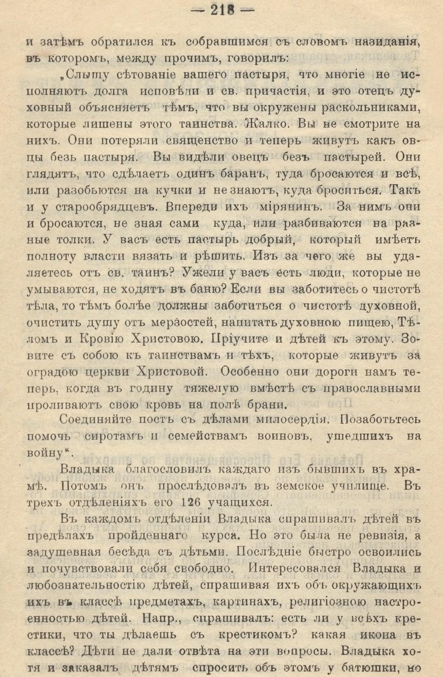 Владыка произнес речь в храме, в которой призвал всех молиться о даровании победы, жить в мире между собою, каяться в грехах, исправляться, привлекать в церковь уклонившихся от нее старообрядцев, помогать всем нуждающимся в помощи и особенно семьям воинов.
