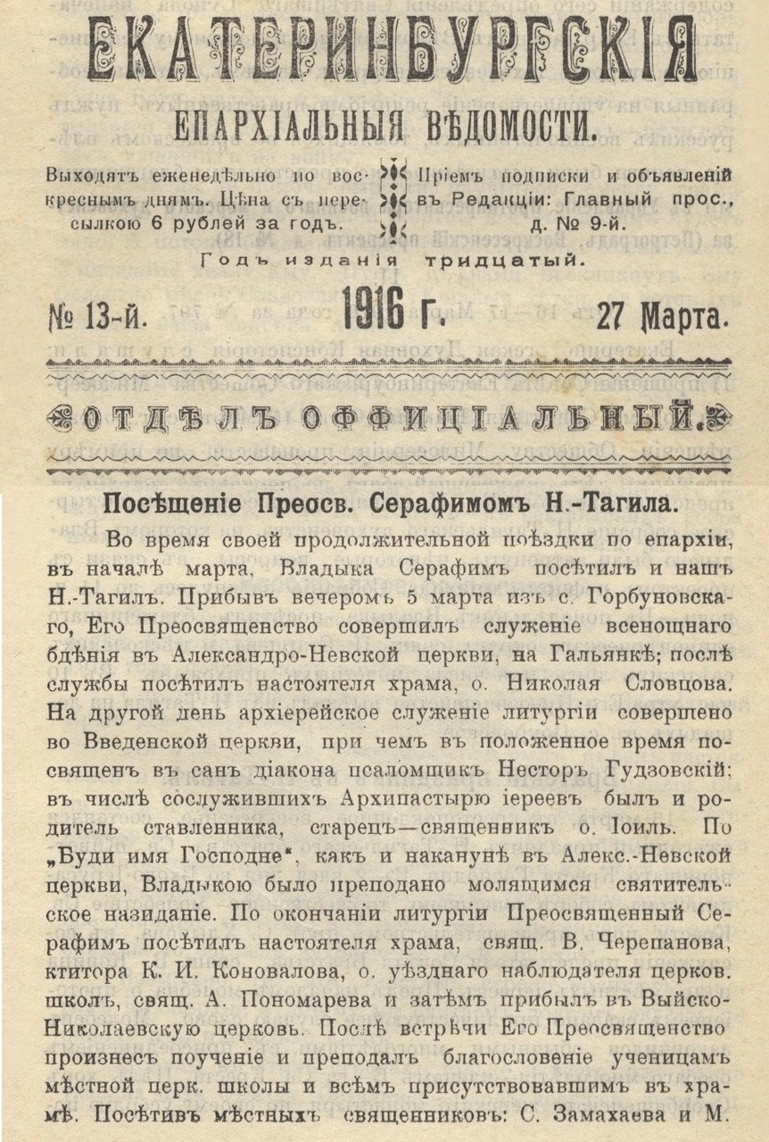 Во время объезда епархии в марте 1916 года епископ Екатеринбургский и Ирбитский, Владыка Серафим вечером 5 марта (18 марта по нов. ст.) прибыл в Нижний Тагил. Его Преосвященство совершил всенощное бдение в Александро-Невской церкви на Гальянке, а после службы посетил настоятеля храма, отца Николая Словцова.