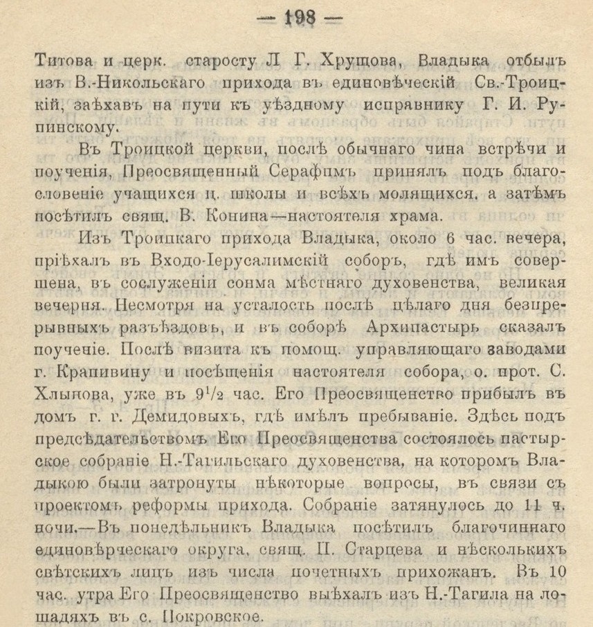 Из Троицкого прихода Владыка приехал во Входо-Иерусалимский собор, где им была совершена, в сослужении местного духовенства, великая вечерня. После вечерни Владыка сказал поучение. После визита к помощнику управляющего заводами Крапивину и посещения настоятеля собора, отца Симеона Хлынова, его Преосвященство прибыл в дом господ Демидовых. Здесь под председательством его Преосвященства состоялось пастырское собрание Нижне-Тагильского духовенства.