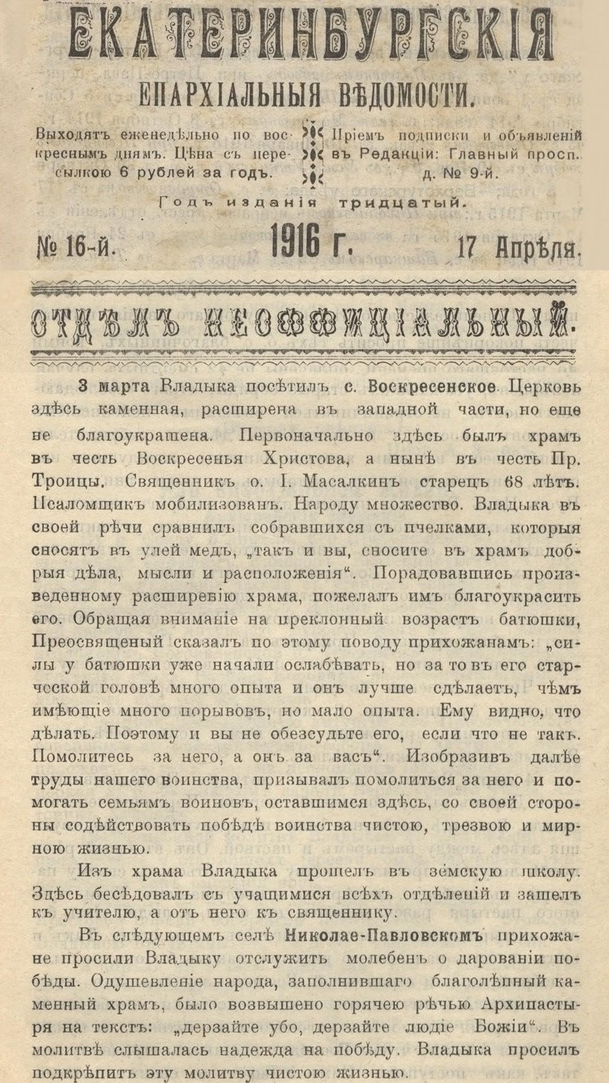 (Благодарность в подготовке материала члену Российского военно-исторического общества Роману Леонидовичу Арефьеву. По материалам «Екатеринбургских епархиальных ведомостей», № 16 от 17 апреля 1916 года)