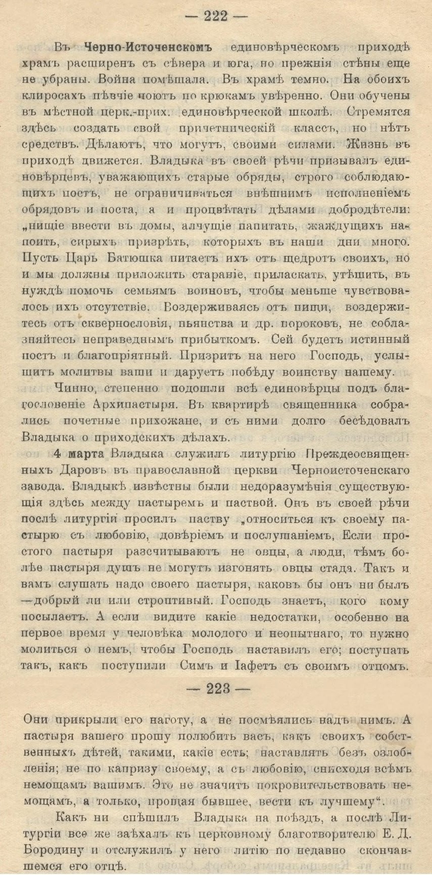 Из Николо-Павловского Владыка отбыл в Черно-Источинский завод, где сначала посетил единоверческий приходской храм (во имя Покрова Пресвятой Богородицы). Преосвященнейший в своей речи призвал прихожан не ограничиваться внешним исполнением поста и обрядов, но и «процветать делами добродетели», помогая в том числе семьям воинов.