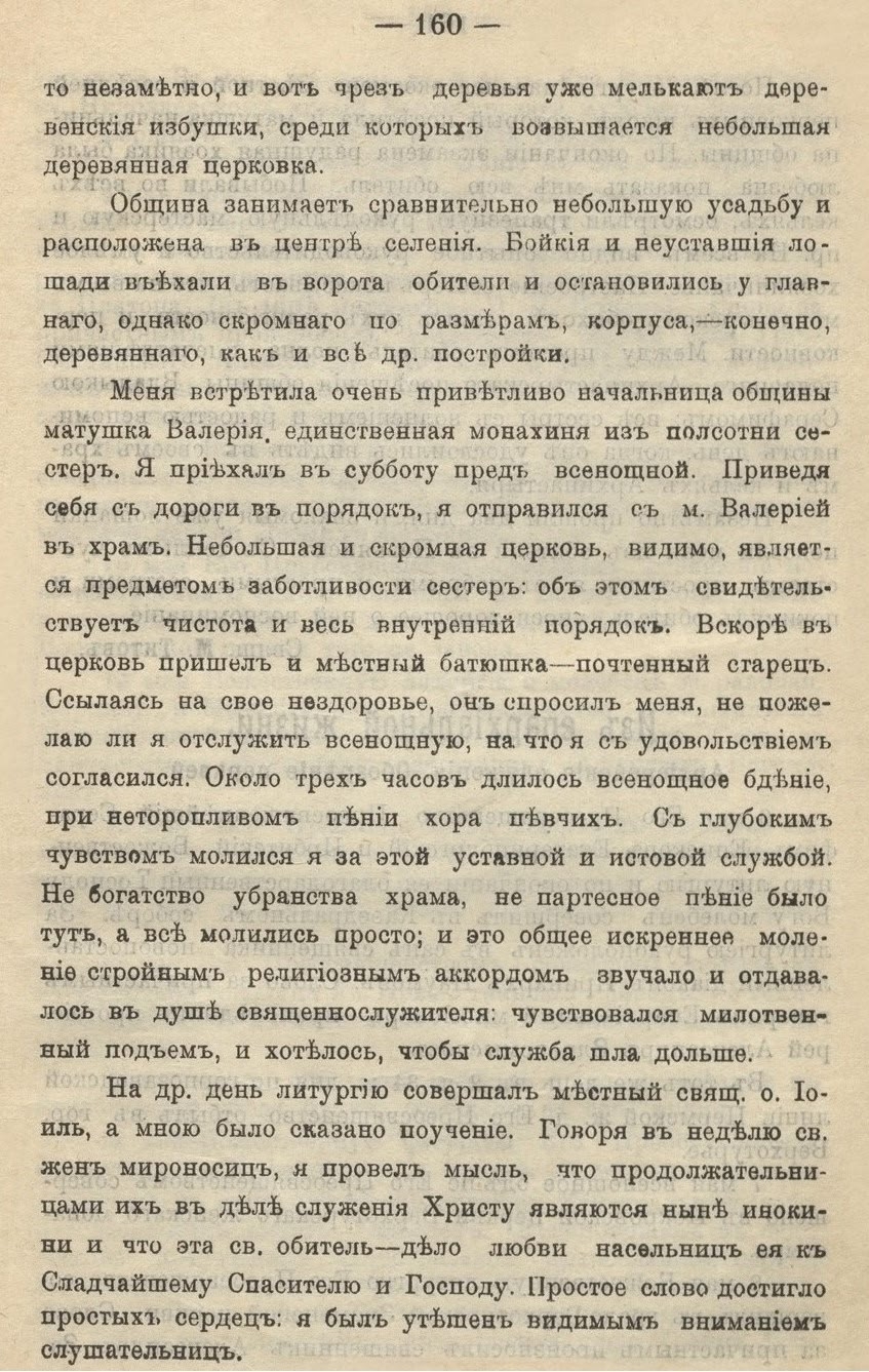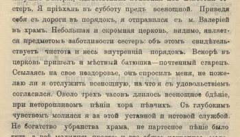 «С глубоким чувством молился я, — писал отец М. Титов, — за этой уставной и истовой службой. Не богатство убранства храма, не партесное пение было тут, а все молились просто; и это общее искреннее моление стройным религиозным аккордом звучало и отдавалось в душе священнослужителя: чувствовался молитвенный подъем, и хотелось, чтобы служба шла дольше».