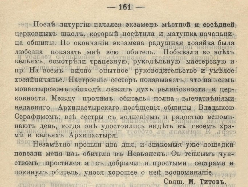 В обратный путь отец М. Титов отправился, отметив, что «на всем монастырском обиходе лежит дух религиозности и церковности».