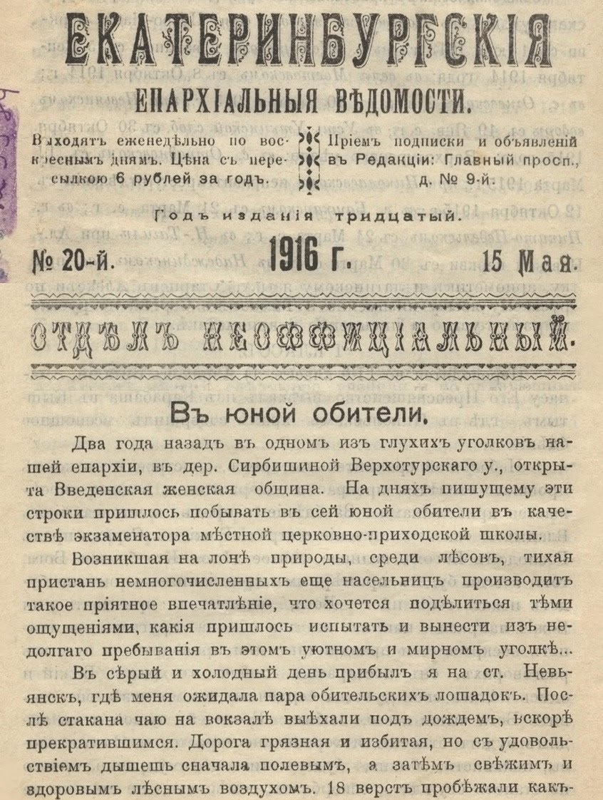 В неделю Святых Жен-мироносиц (в апреле 1916 года) священник М. Титов из Нижне-Тагильского завода посетил Сербишинскую Введенскую женскую общину. Он приехал в субботу, перед всенощной службой.