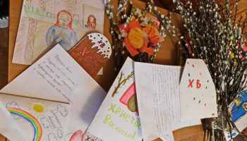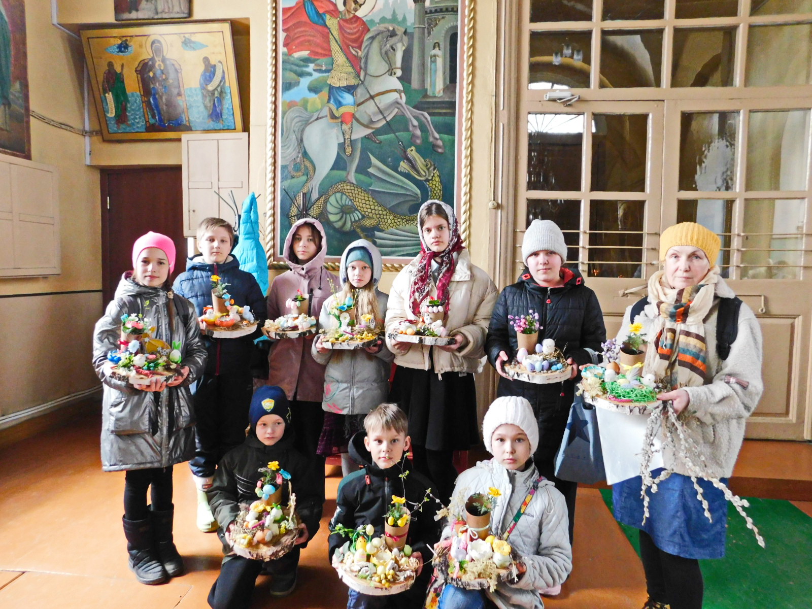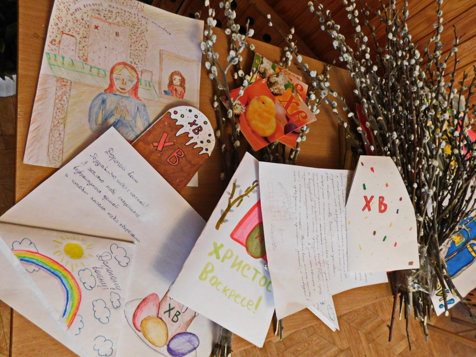А далее ребята вместе с композициями прошли в храм и установили их на подоконниках . К празднику Пасхи учащиеся написали поздравительные открытки, рисунки для воинов, которые отправлены с гумпомощью от Знаменского храма.