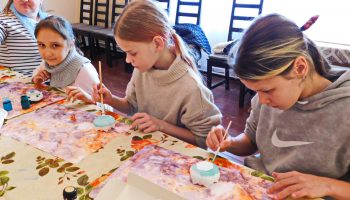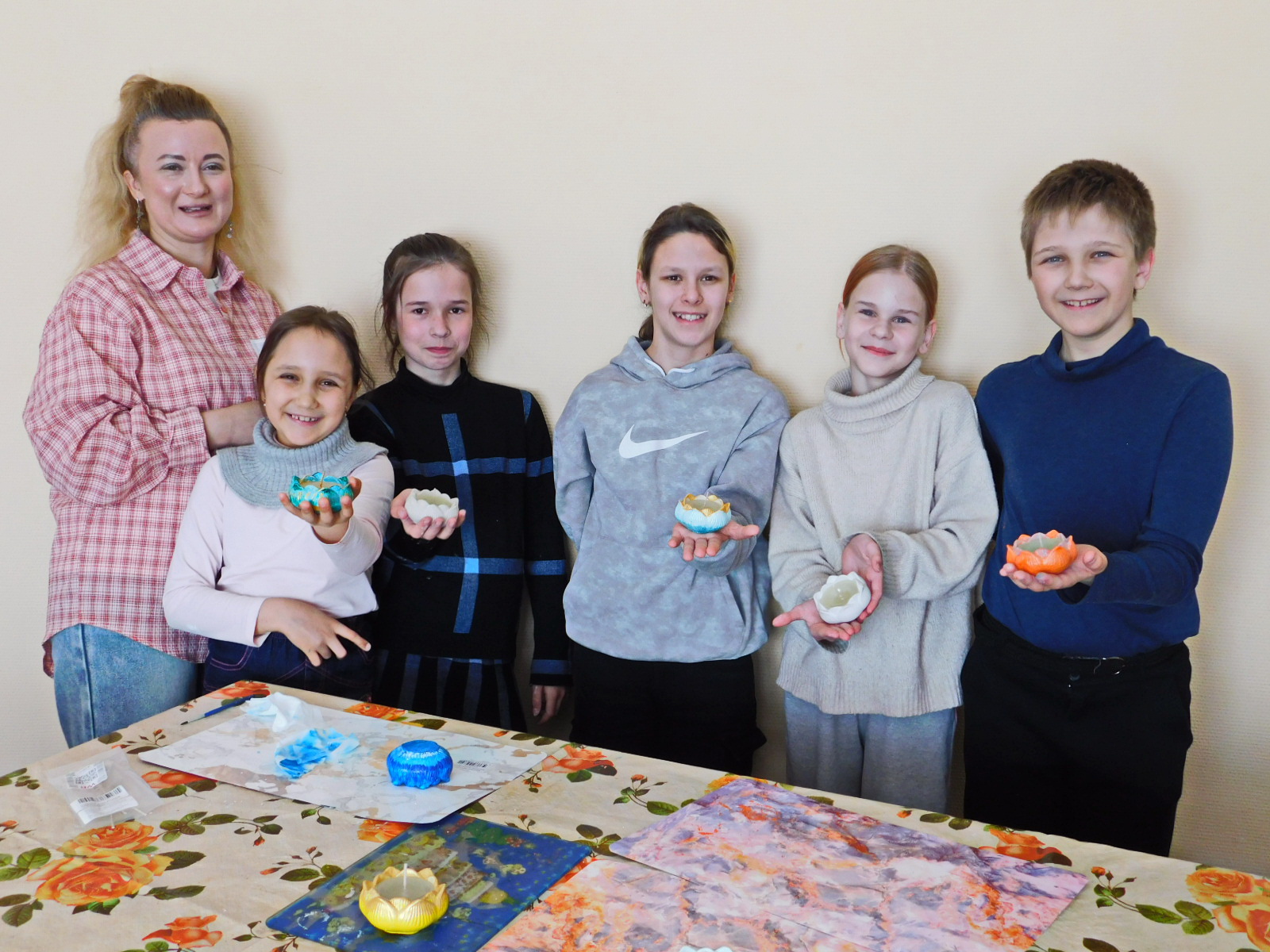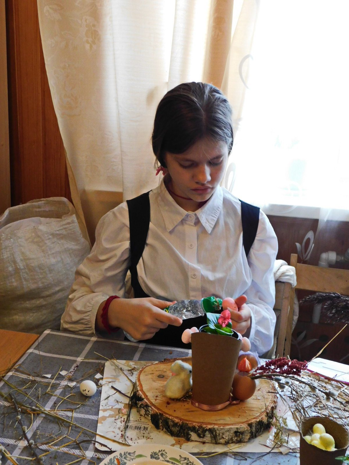 Обучала этому искусству Светлана Васильевна Панова — профессиональная художница. Завершением составления композиции продолжила на следующем творческом уроке Валентина Владиславовна Коробицына подготовила интересные пасхальные элементы: фигурки цыплят, скорлупу яиц, рассаду цветов, сухоцветы , веточки вербы и другие. Композиция выполнялась на спиле березы. Каждый из ребят проявил фантазию.