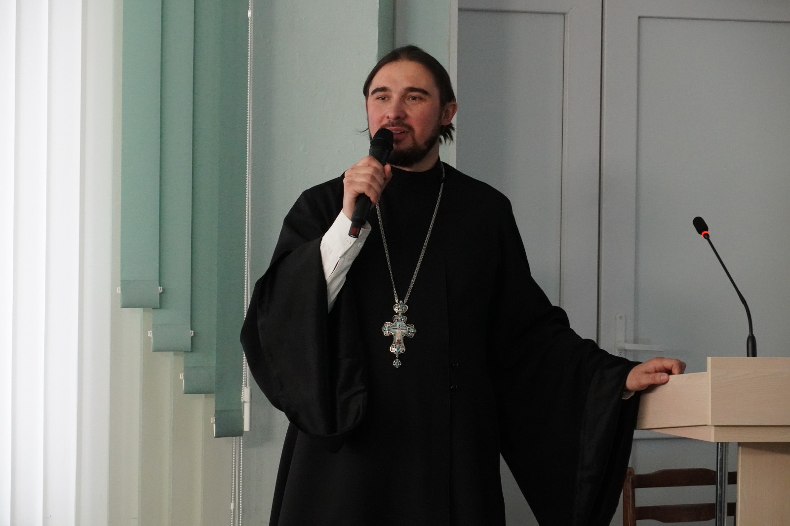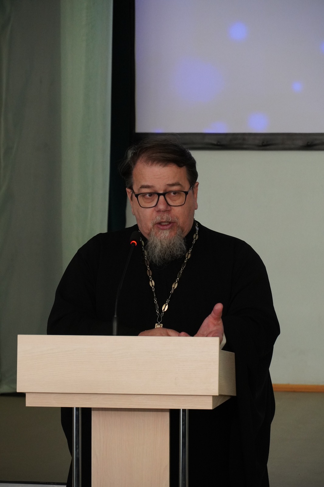 Иерей Константин Корепанов, духовник и преподаватель Екатеринбургской духовной семинарии, учитель ОПК Православной Свято-Симеоновской гимназии, клирик Свято-Троицкого собора г. Екатеринбурга, выступил с докладом на тему «О взаимодействии просвещения и нравственности в контексте эпохи». О. Константин в своем выступлении обозначил ведущую роль учителя в судьбе ученика. Педагог может и не обладать полным спектром знаний своего предмета, так как знает искусственный интеллект, но именно качества человечности и гибкости ума дает большое преимущество перед новыми технологиями. «Не надо нам самим забывать какое высокое звание мы носим. Мы учителя, без нас, даже если везде будет искусственный интеллект, образование человека, формирование человека, воспитание человека, становление человека будет просто невозможно. Без нас человечеству не выжить», — подчеркнул докладчик.
