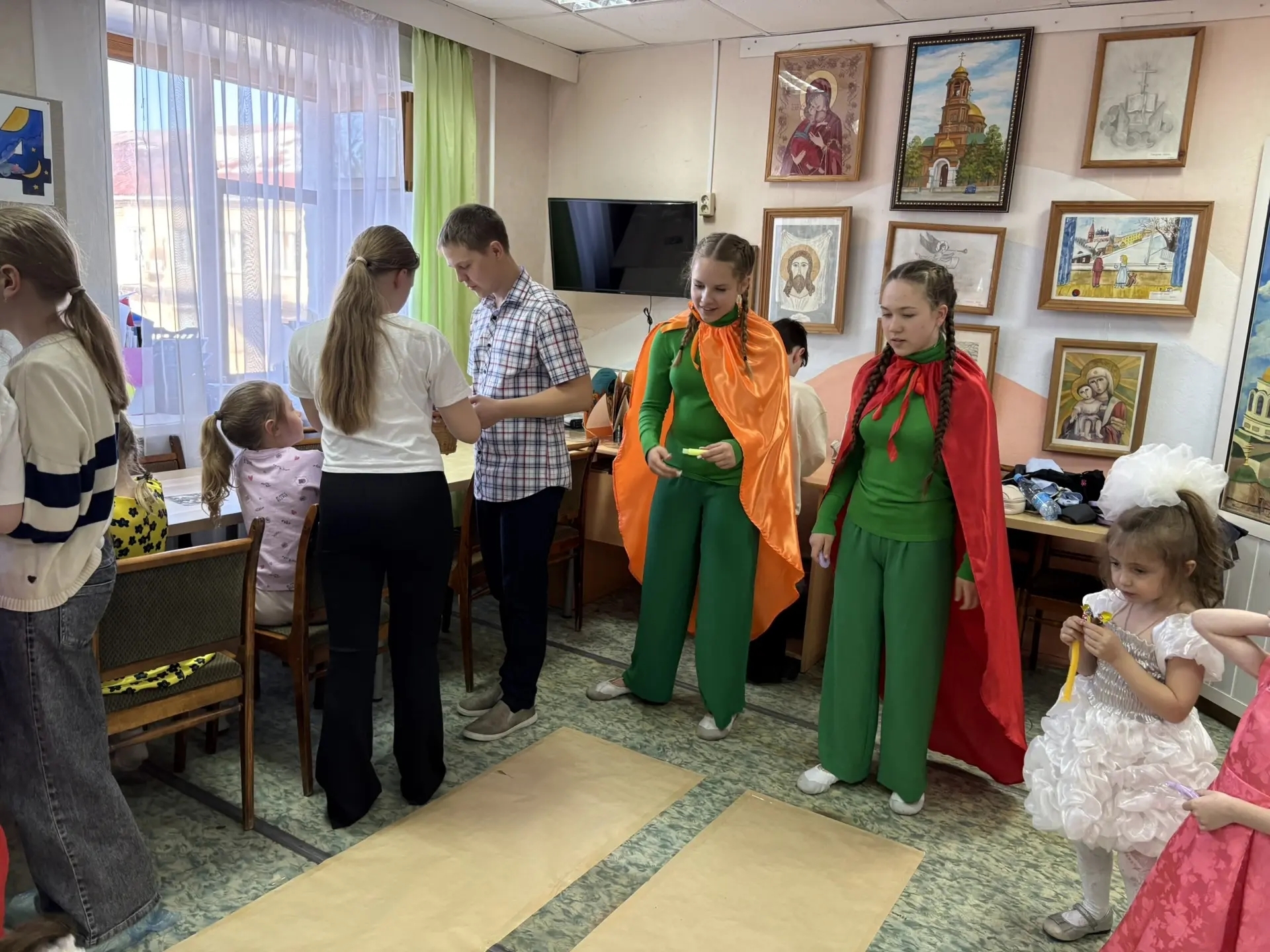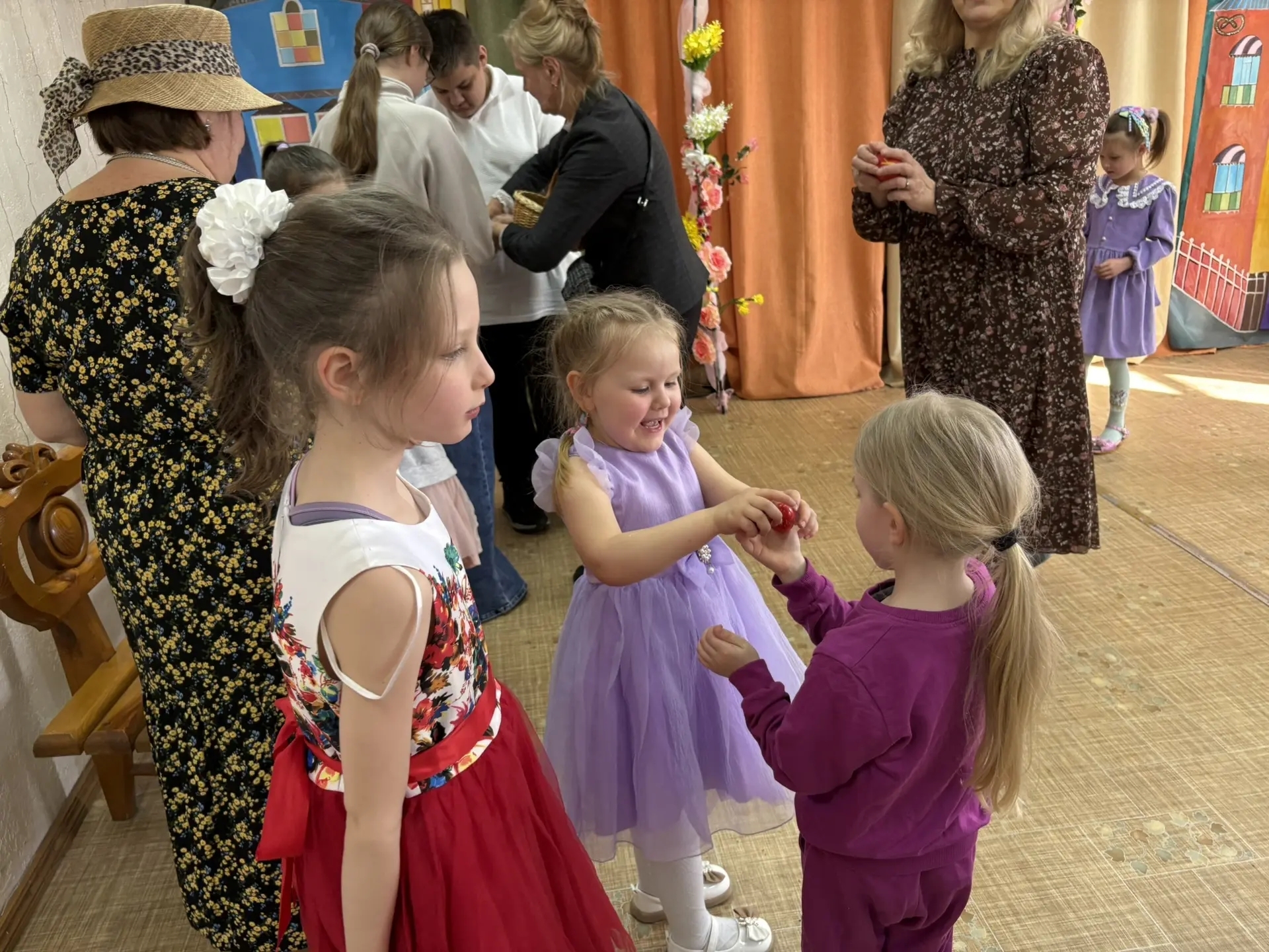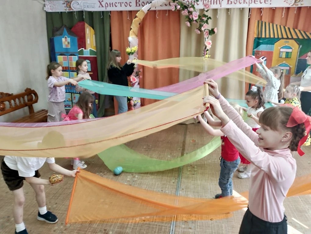 Особую радость вызвал заключительный номер: танец с алыми цветами, сложившимися в надпись «ХВ» — Христос Воскресе. Участники постановки и юные гости получили подарки от Отца Василия. Позже прошли игровые поляны, где ребята соревновались в традиционных русских народных забавах.