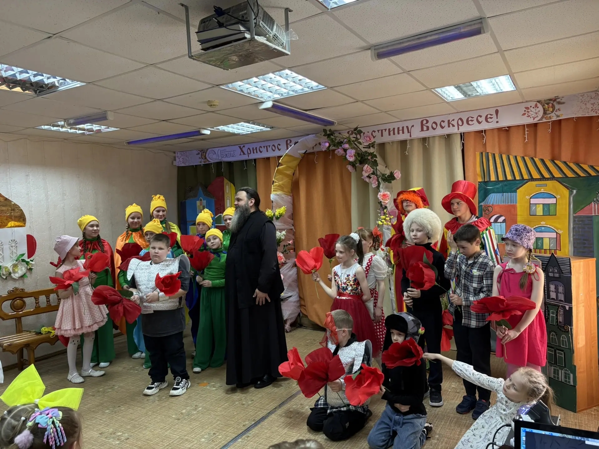 Вначале всех собравшихся со светлым праздником поздравили Отец Василий и Отец Евгений. Коллектив церковно-приходской школы — преподаватели и ученики — подготовили спектакль «Цветик-семицветик» по сказке Валентина Катаева, придав знакомой истории православное звучание. Стержнем постановки стали слова Феи о том, что нужно открыть сердца Господу, быть добрыми, терпеливыми.