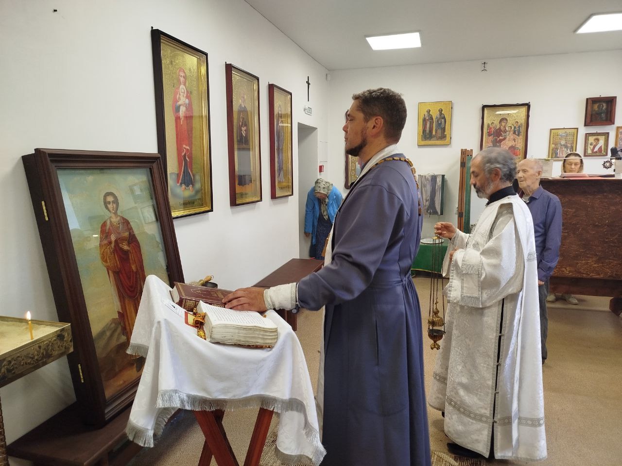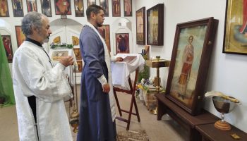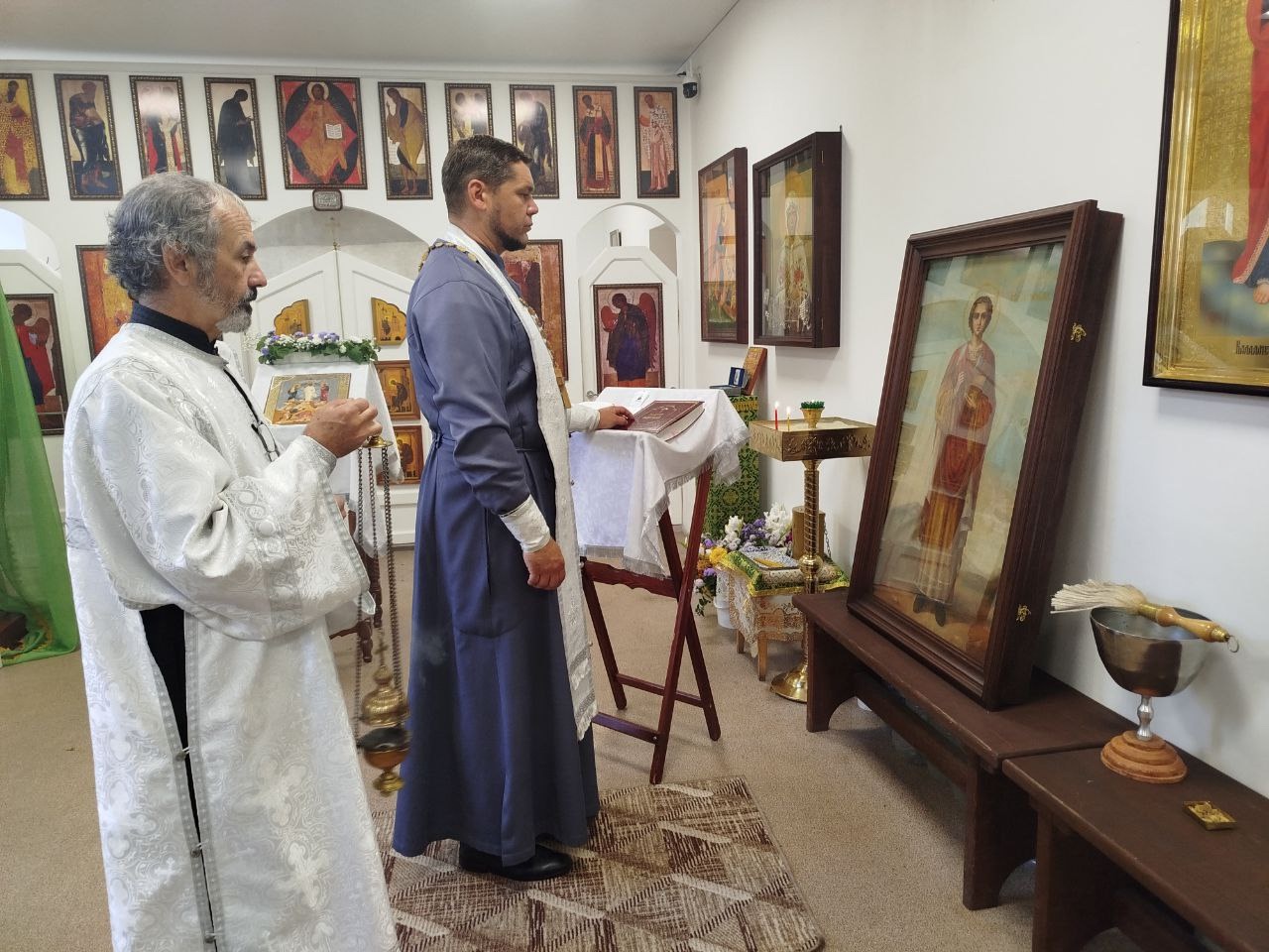 Настоятель, иерей Алексий Занозин и диакон храма Николай Яровенко с прихожанами отслужили молебен великомученику и целителю и затем батюшка совершил чин освящения иконы святого. Слава Богу, что есть замечательные неравнодушные люди, радеющие о благоукрашении храмов Божиих!