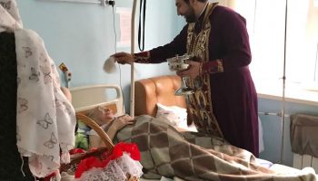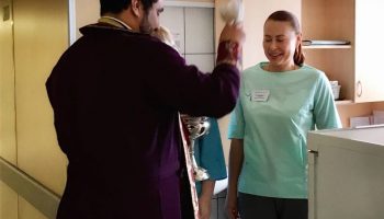 Пациентов и персонал, палаты и помещения отделения под пение Пасхального тропаря батюшка окропил святой водой. Каждому был вручен Пасхальный расписной пряник.