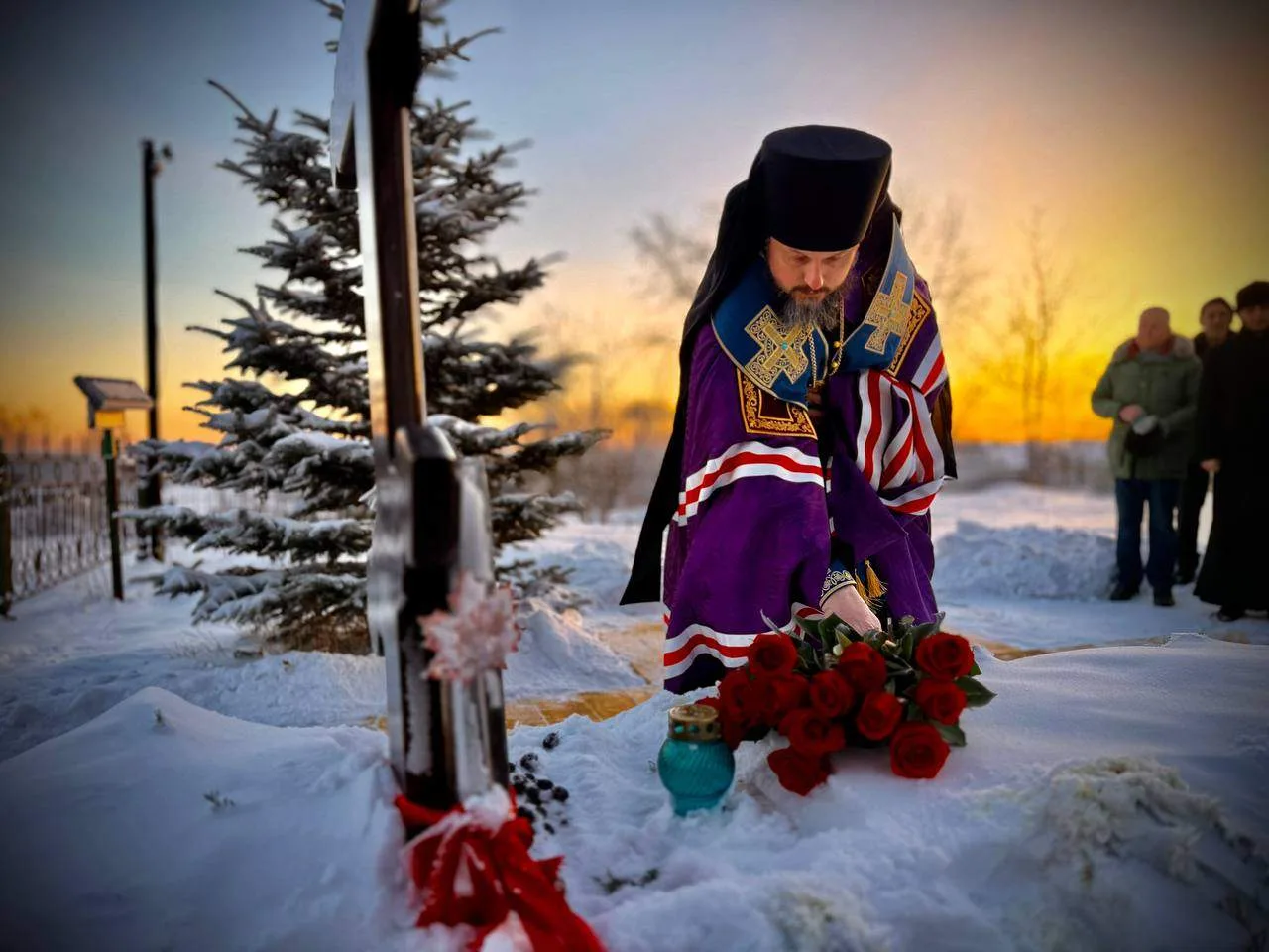 В начале Богослужения Преосвященнийший Владыка, совершил литию об упокоении бывшего настоятеля храма митрофорного протоиерея Геннадия Ведерникова. По завершении литии Преосвященнийший Мелитон возложил цветы на могилу почившего пастыря, рассположенную за алатраной частью храма.