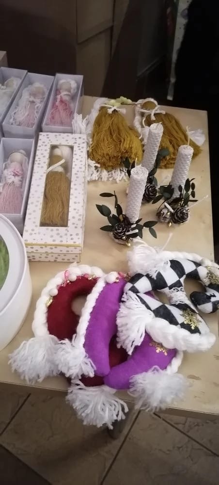 На столах — консерванты, ароматная пастила. Рядом — воздушный зефир, пряники и душистый травяной чай. Изящные подсвечники, готовые принять рождественскую свечу, уютные чайные домики, словно сошедшие со страниц сказок. Куколки и лошадки, сшитые и связанные так искусно, что кажется, вот-вот оживут.
