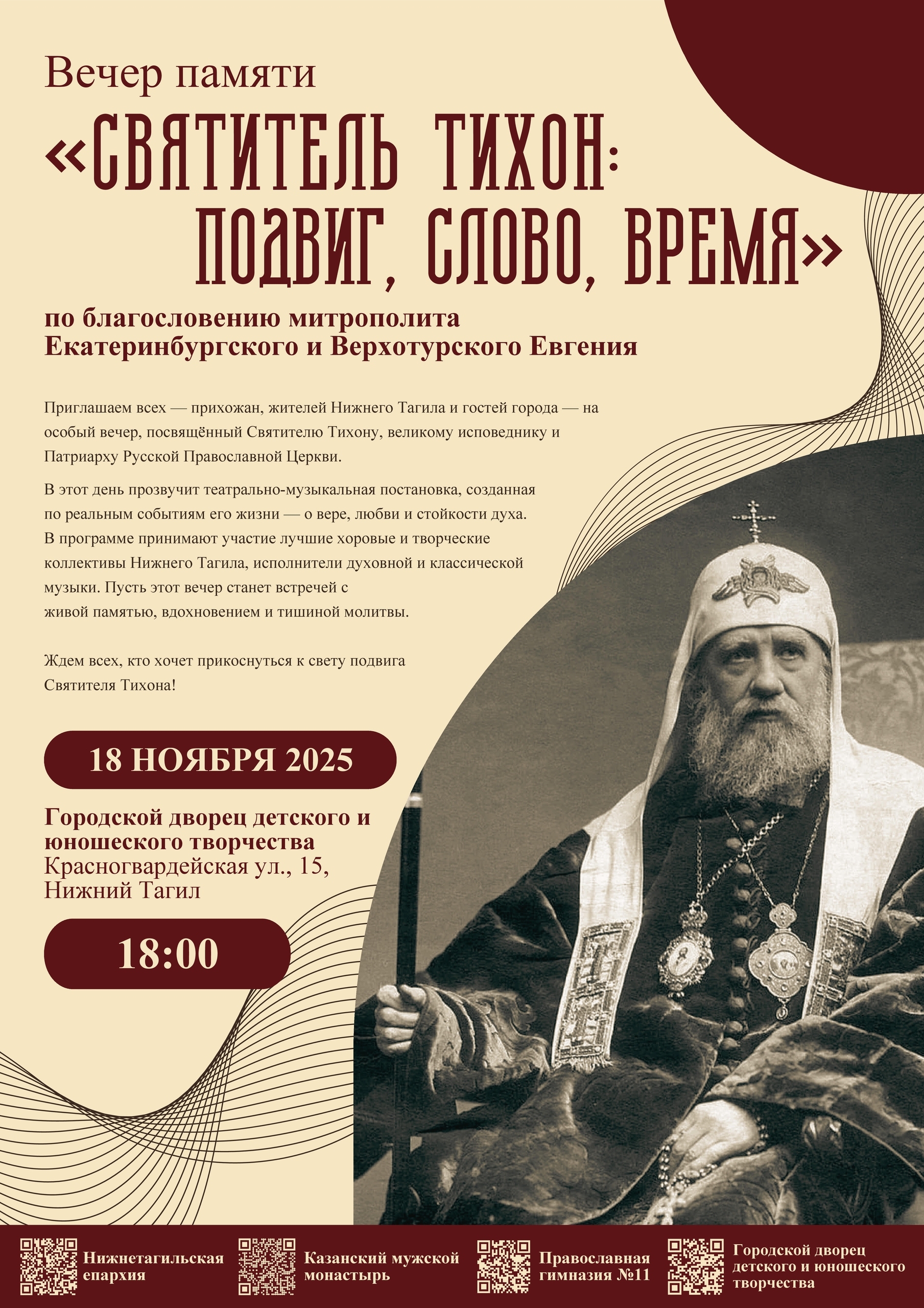 Приглашаем всех — прихожан, жителей Нижнего Тагила и гостей города — на особый вечер, посвящённый Святителю Тихону, великому исповеднику и Патриарху Русской Православной Церкви.