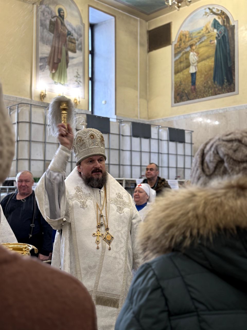 По окончании Литургии, верующие торжественно пропели тропарь, кондак и величание празднику Богоявления, и Владыка Мелитон после чего окропил народ святой водой.