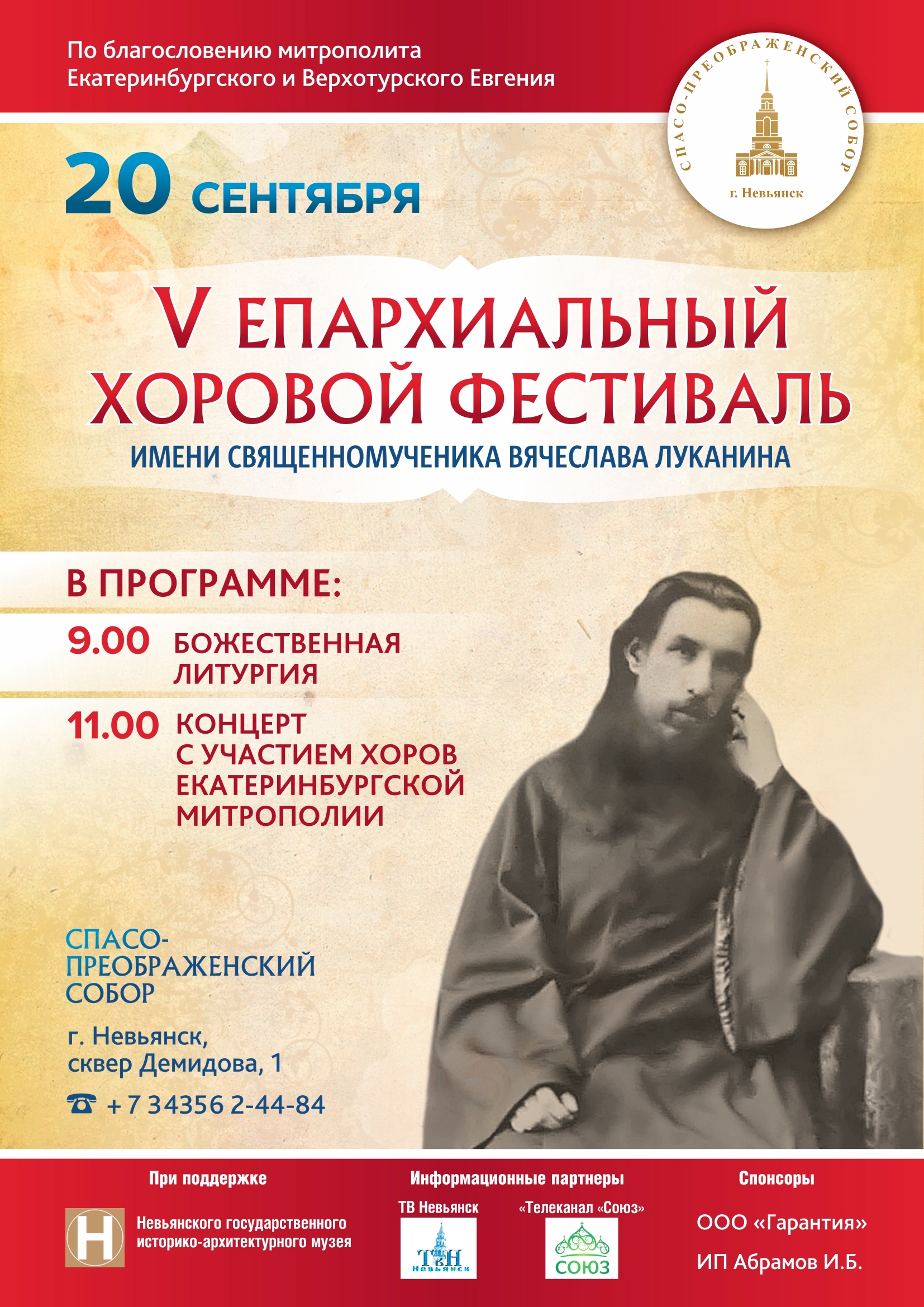 20 сентября 2025 года по благословению митрополита Екатеринбургского и Верхотурского Евгения в Спасо-Преображенском соборе города Невьянска пройдет V епархиальный хоровой фестиваль имени священномученика Вячеслава Луканина.