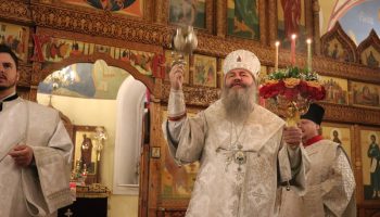 После заамвонной молитвы Преосвященнейший Феодосий совершил чин освящения артоса – особого хлеба, символизирующего невидимое присутствие Воскресшего Господа Иисуса Христа с верующими в течение всей Светлой седмицы.