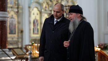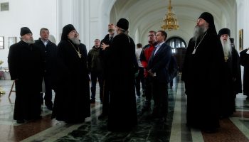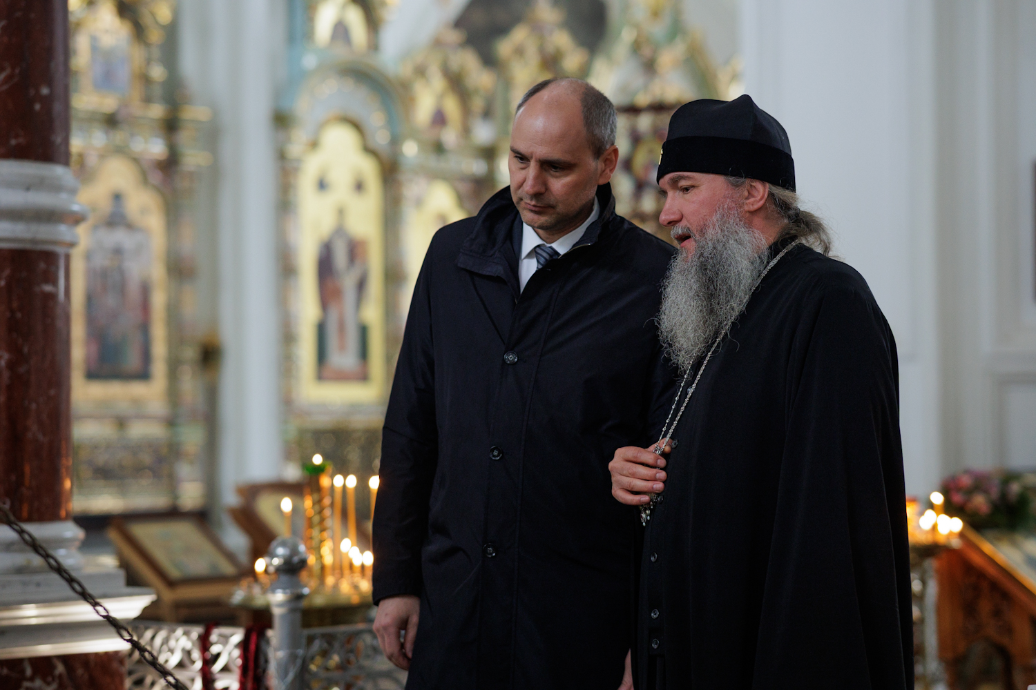 Завершилась поездка посещением Крестовоздвиженского собора, где покоятся мощи святого Симеона Верхотурского. Губернатор Денис Паслер предложил увековечить память купца Максима Походяшина — основателя городов Северного Урала.